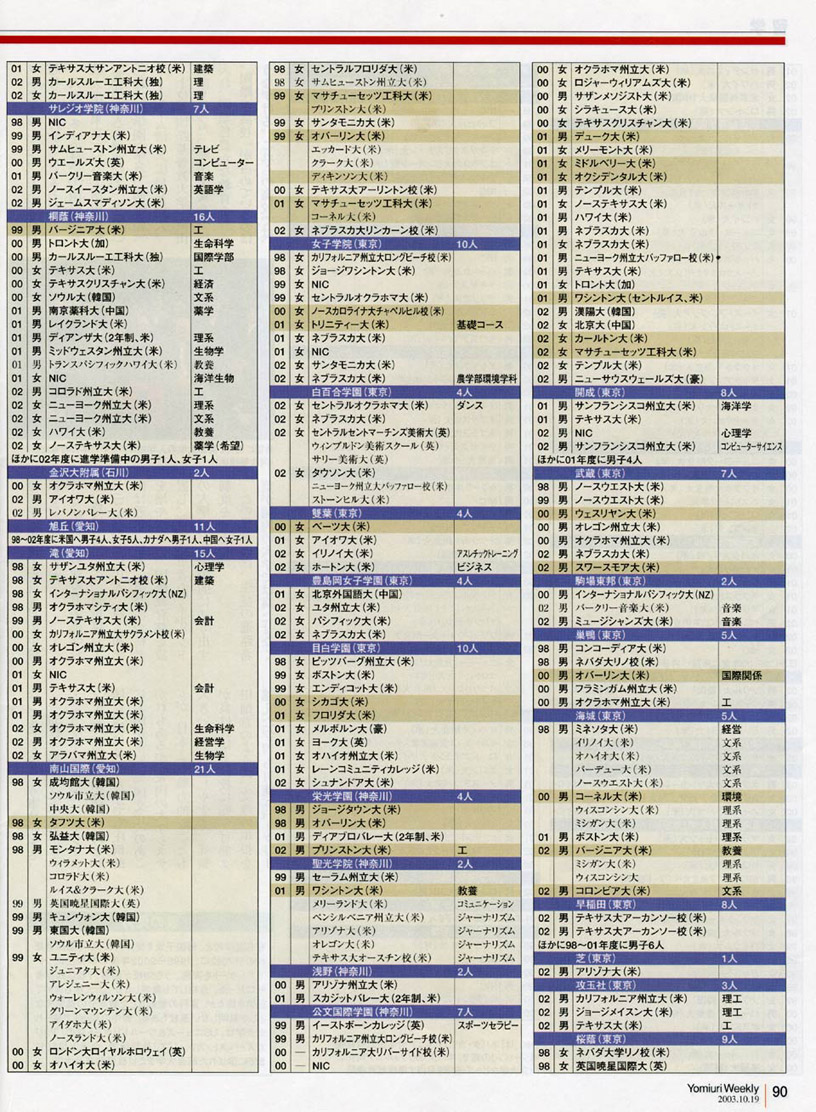 読売ウイークリー 2003.10.19 『有名59高校「海外進出力」』